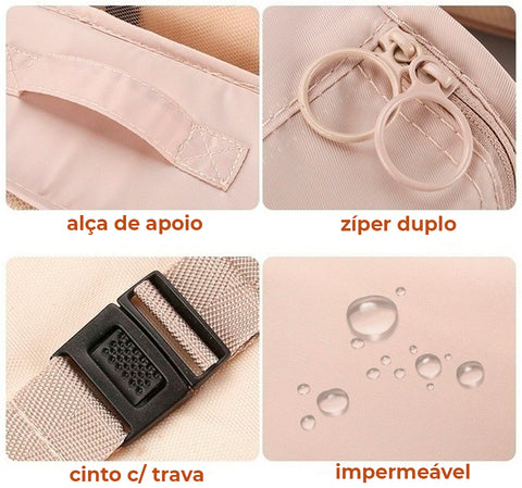 O tecido impermeável mantém suas roupas e acessórios protegidos de imprevistos climáticos, garantindo que tudo chegue seco e em ótimo estado, mesmo em viagens com condições adversas.